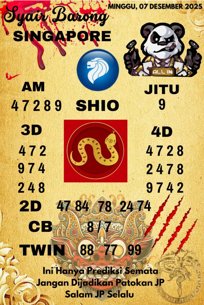 Prediksi DENSUSTOTO menyediakan Syair Togel Singapore resmi yang dapat anda saksikan dalam situs judi togel online ini. Setiap pemain judi togel online yang tidak memandang dan mengenal syair togel singapore pastilah kurang mujur buat mendapati angka keluaran togel terjitu. Lantaran itu sekarang situs judi togel online DENSUS TOTO sekarang akan memberikan anda bocoran bagaimana caranya mendapati nomor keluaran prediksi singapore dari syair togel sgp terjitu. Sekarang anda cuma perlu dan mengenal code syair singapore ini merupakan prediksi singapore yang dituang terdapat sifat code syair. Maka serius tidak bertanya-tanya jikalau sejumlah penggemar togel begitu menyintai prediksi syair togel ini. Buat prediksi syair singapore dapat dipakai buat bahan ketidaksamaan mencari angka jitu yang bisa keluar pada hari ini. Karenanya berhati-hatilah selalu pada setiap terdapat dipicu di situ dapat anda angka bermain 2D, 3D dan 4D